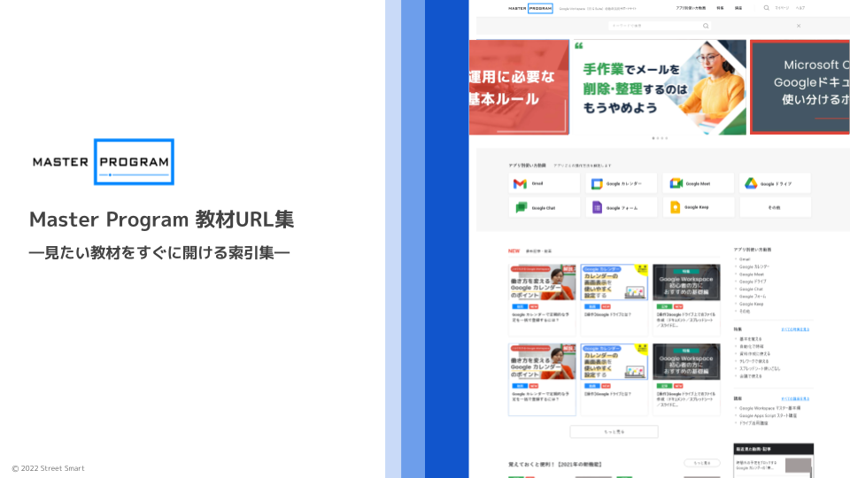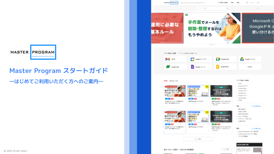 Master Program は法人様にご契約いただき利用いただいている会員制のサービスです。所属されている組織からの案内で本サービスをご利用いただいている場合は、組織でご利用されている Google アカウントでログインいただくとすべてのページを閲覧できるようになります。組織の Google アカウントでログインしてもご利用いただけない場合は、お手数をおかけしますが、Master Program事務局(master-program@street-smart.co.jp)までお問い合わせくださいませ。